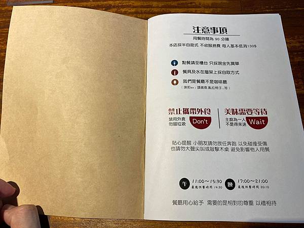 菜單第一頁寫了很清楚注意事項,如禁止外食、餐具、水自取、餐點要等待、勿自己移動椅子等等