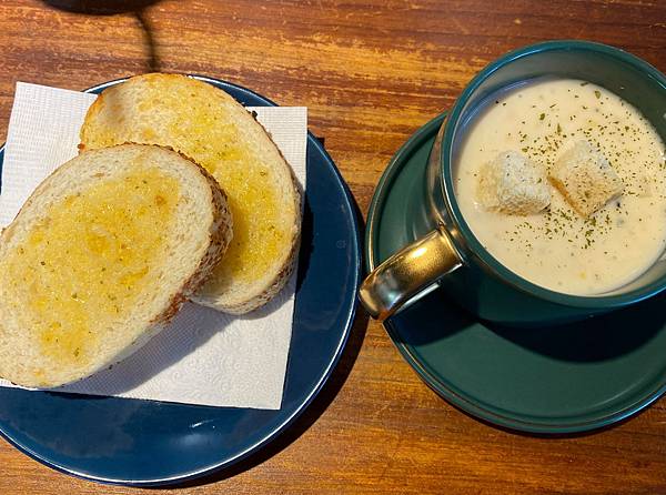 玉米濃湯的奶味滿重的,搭配大蒜麵包很好