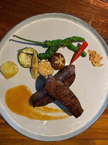 CAB安格斯翼板牛排,另外有香菇、玉米筍、櫛瓜、地瓜、杏包菇、紅椒、蒜片點綴
