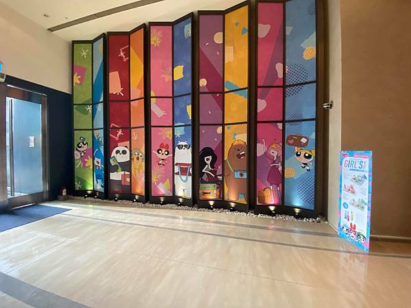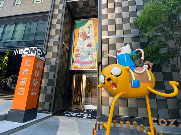 飯店門口位在新光三越小西門旁,門口的老皮和卡通頻道相關人物相當明顯