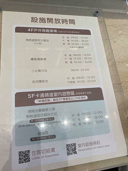 入住時各項設施的開放時間如下,目前也因為疫情關係,室內設施有人數限制,可以先透過LINE預約或者撥電話到總機