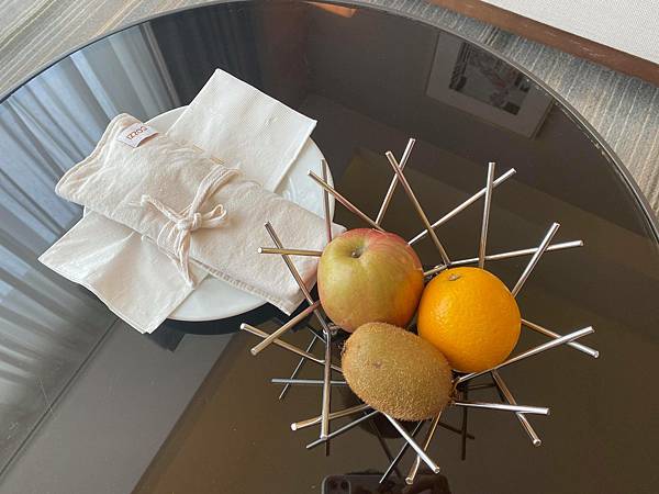 另外有附上迎賓水果,有蘋果、奇異果和柳橙