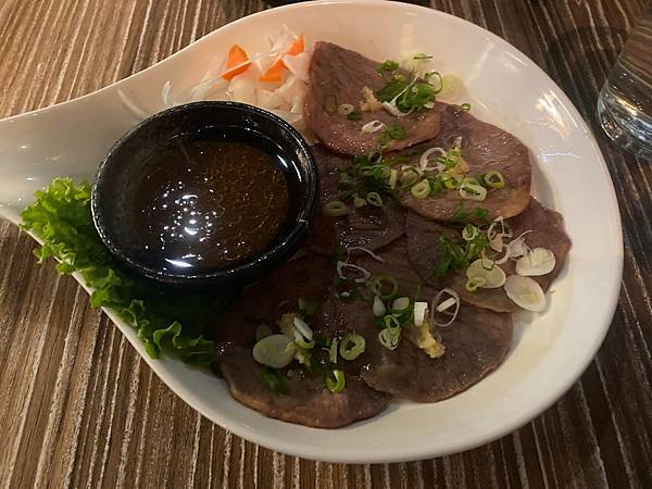 首先第一道菜是鹽烤牛舌 裡面還有泡菜和生洋蔥絲可以一起吃