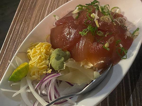 另外鮪魚丼則是有先醃漬過的鮪魚,配上蛋絲、洋蔥等配料