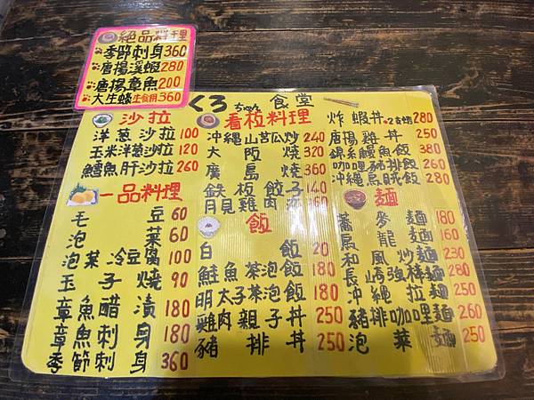 菜單是手寫的 有沙拉、壽司、烤物等等日式料理