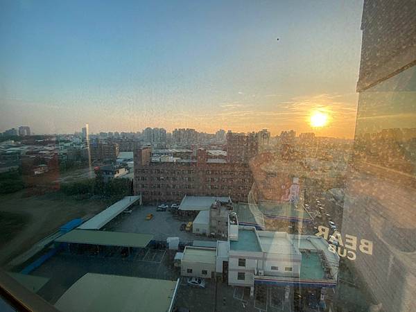 13樓的電梯門前看到的日落風景