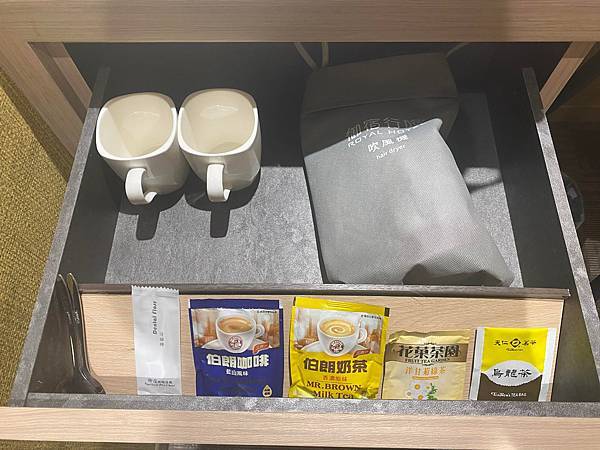 櫃子裡面有茶包和馬克杯 另外雖然吹風機不是壁掛