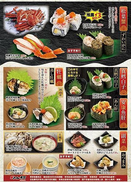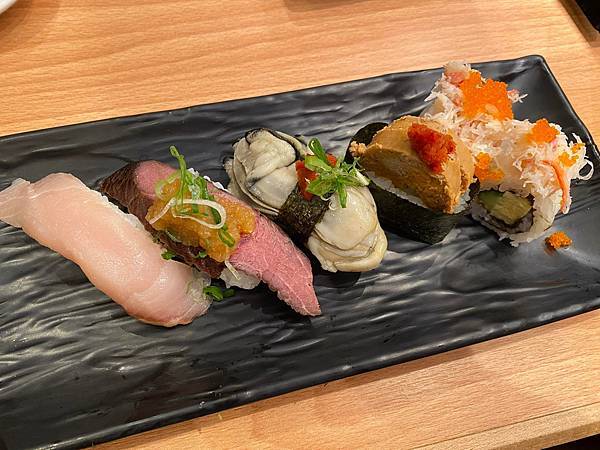 有青甘、牛肉握壽司、牡蠣、安康魚、松葉蟹肉花壽司