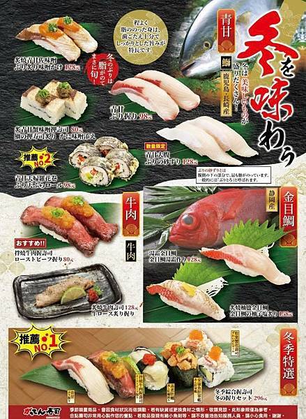 有鮭魚、比目魚、大蝦、鮪魚腹肉
