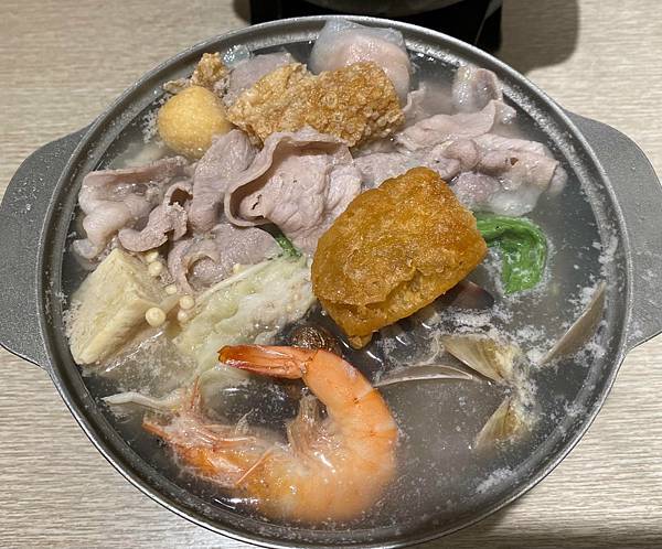 有蝦子、不少肉片、火鍋魚丸、貢丸等等