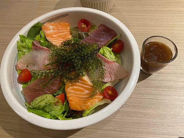 生魚片沙拉則是還有清乾、海葡萄等 搭配青菜和和風醬